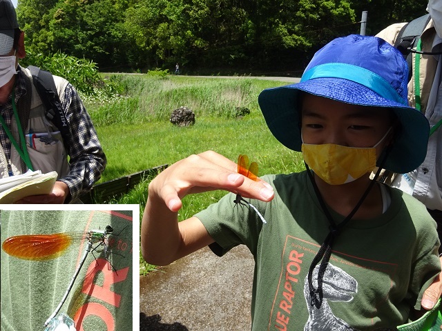05 綺麗な飴色の羽のニホンカワトンボ。離しても しばらくじっとTシャツにとまり、一休み。 |