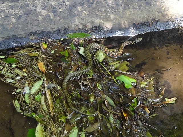 06 用水路をのぞいてみるとヤマカガシもす~いすい。蛙を探しに来たのかな? |