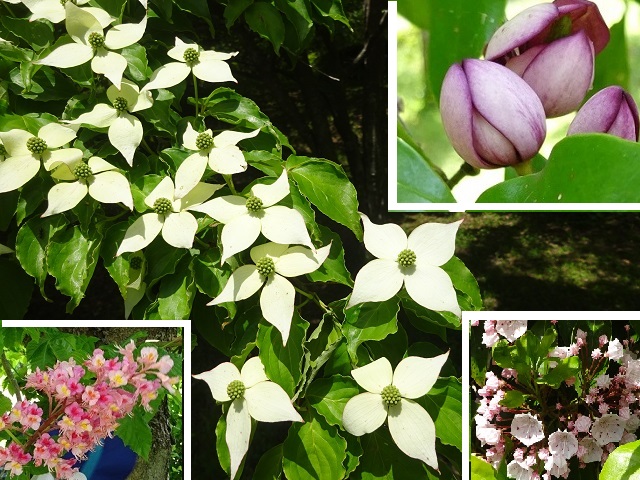 満開のヤマボウシ、甘い香りのカラタネオガタマ、華やかなベニバナトチノキ、 |