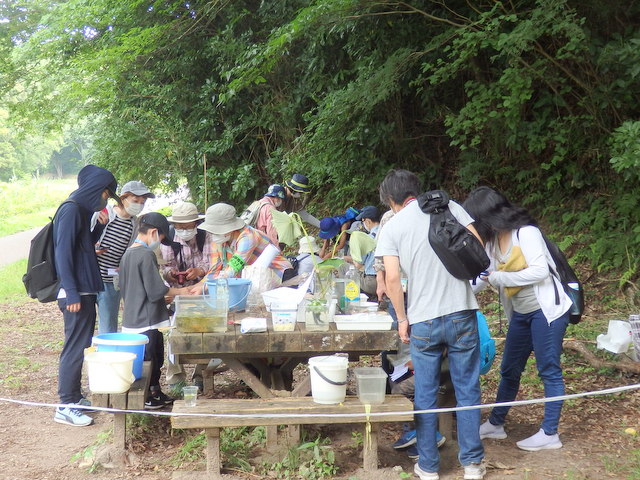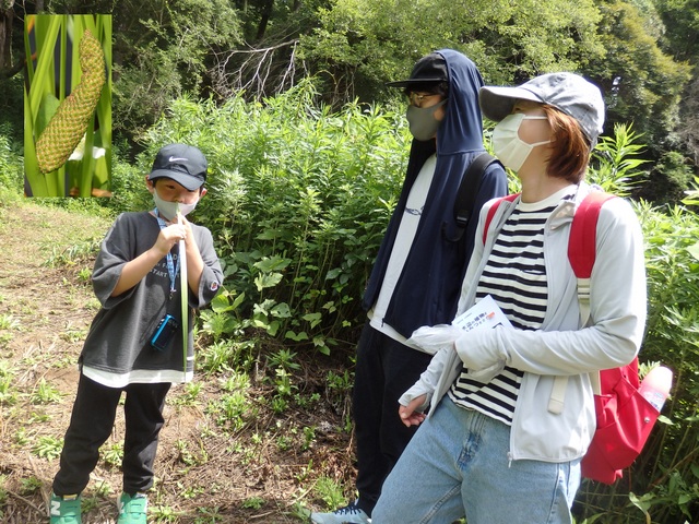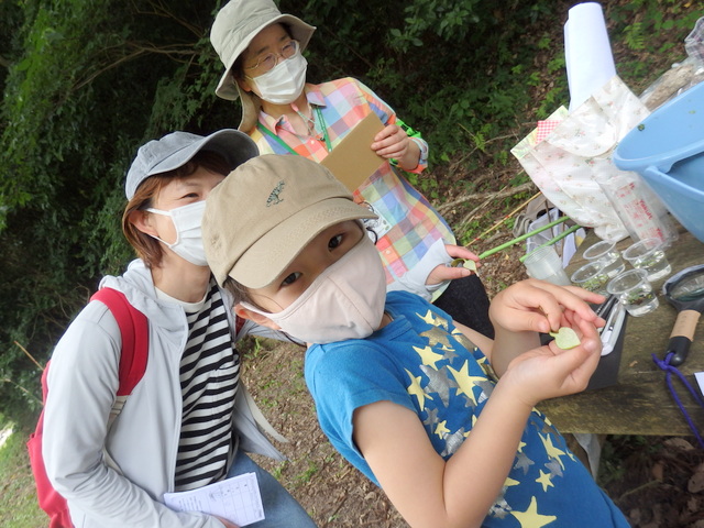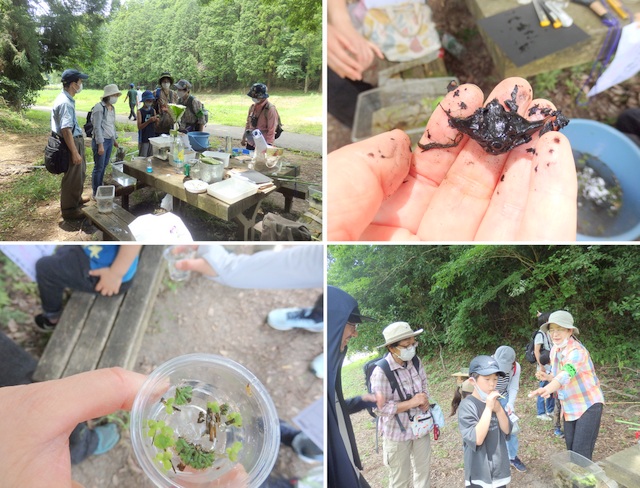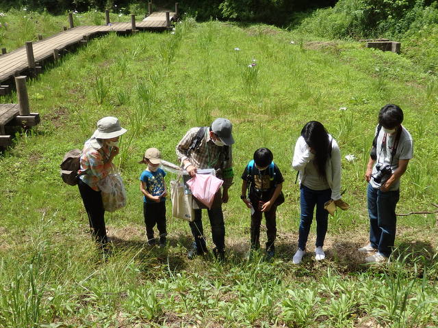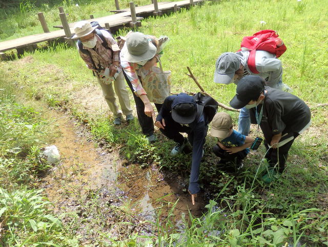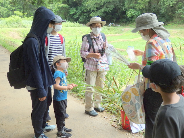 |   6月自然観察会は ホトトギスやオオヨシキリなどの鳴声を聞きながら、水辺に生える植物の茎や根っこ、葉っぱのひみつ探りをしました。参加者の皆さんは、水辺の植物が浮かんだり、呼吸したりするしくみを知り、植物の知恵に感心していました。また、水辺は涼しく、水生植物と共にたくさんのカエルやトンボ等の生き物も観察し、楽しい時間を過ごしました。 | |