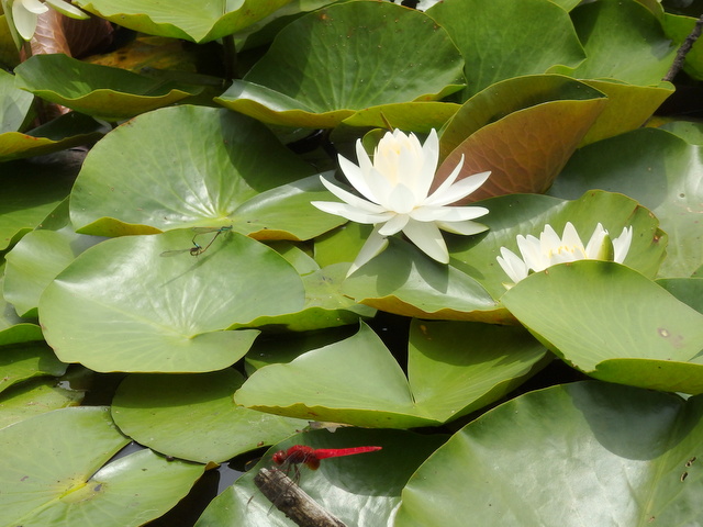 スイレンの葉っぱの中で、アオイトトンボが交尾をしたり、 |