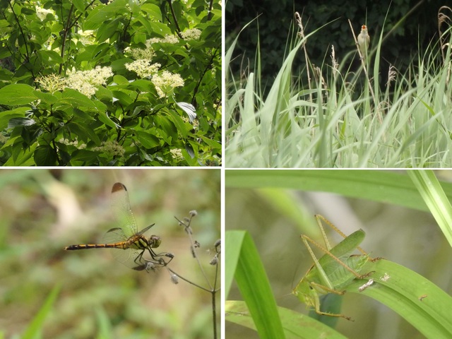 オオヨシキリの「ギョギョシ、ギョギョシ」の鳴声、クマノミズキの花、ヤブキリ。 |