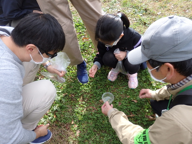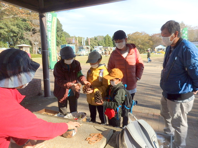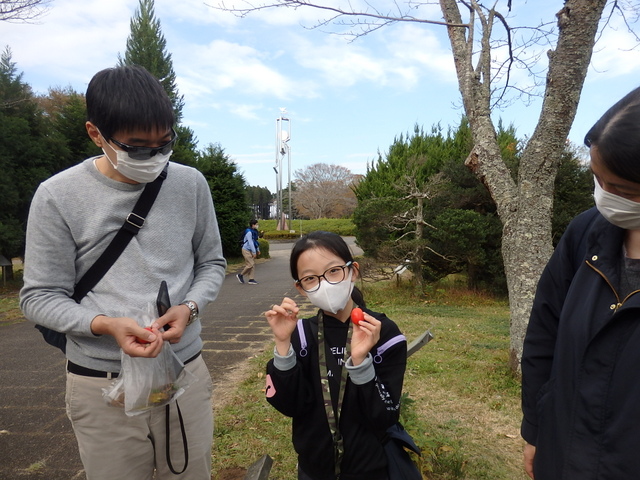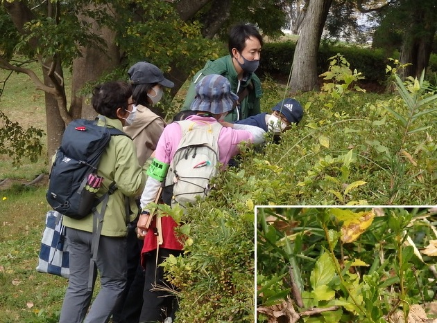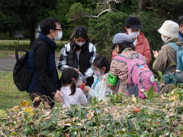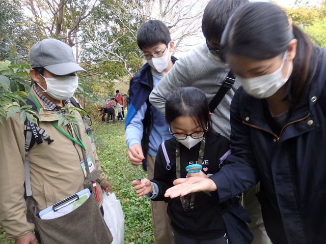 |   晩秋の小春日和の中、「タネの旅」観察会が実施されました。参加者の皆さんは、普段何気なく見ている木々や草等のタネや実を実際に触ったり、匂いをかいだりして、形や色などを確かめました。動けない植物が自分たちの子孫を多く残すために、動物や自然の風などを利用して種を遠くへ運ぶ工夫を知り、大いに感心しました。 | |