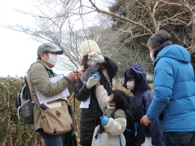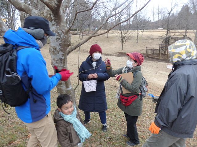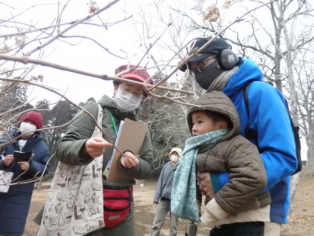 小雨の中、「植物の冬の過ごし方」観察会が実施されました。落葉樹は、寒さと乾燥の 冬に身を守るために冬芽を作り、春になると花や葉っぱを成長させます。   参加者はコブシやハクウンボク等の小さな冬芽の中に、たくさんの若葉や花等の準備が されていることを知り、大いに感心していました。 |