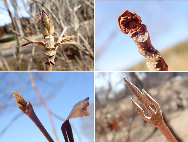 09 上左からアジサイ、ニガキ、ハクウンボク、ムラサキシキブ、どの冬芽も面白い顔(^▽^)/ |