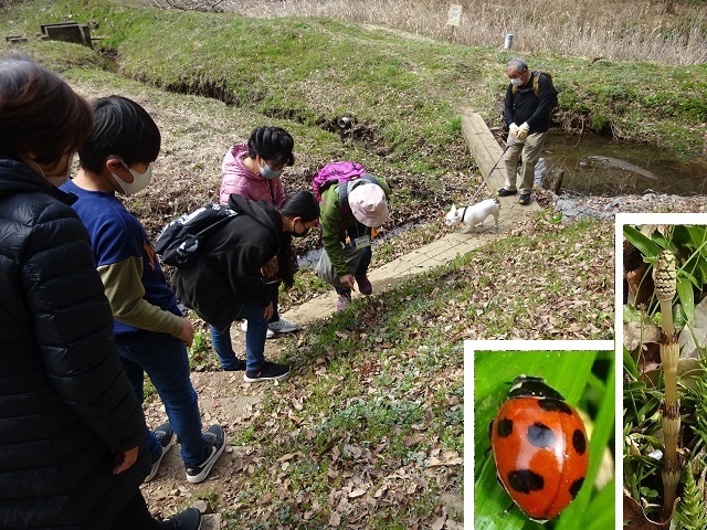 |   少し曇って肌寒い中、「早春の生き物たち」の観察会が実施されました。芽を出し始めたばかりの植物や小さな虫たち、二ホンアカガエルのオタマジャクシに出会い、参加者は春の訪れを感じ楽しむことができました。 | |