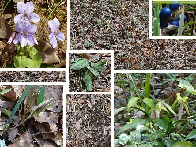 10 左上タチツボスミレ、右上ジャノヒゲの実、左下アマナのつぼみ、右下シュンラン、中心カタクリ |