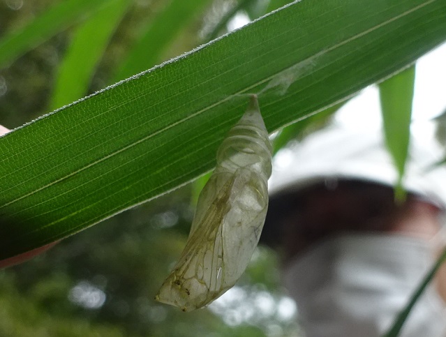 昨日見たときは、羽化前だったけれど、きれいなヒカゲチョウ?の蛹の抜け殻。 |
