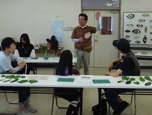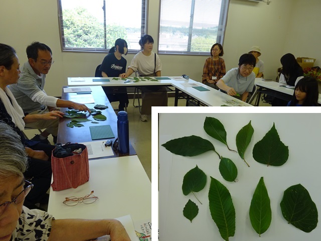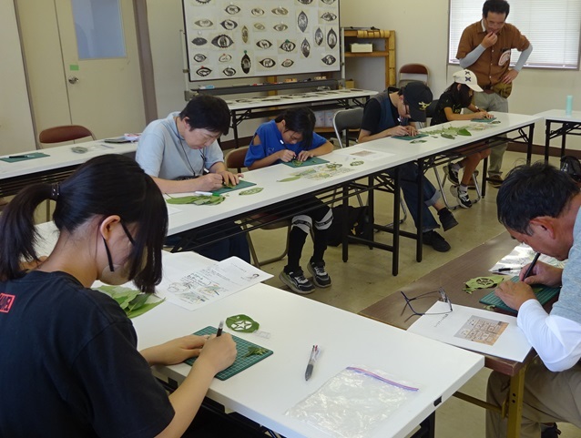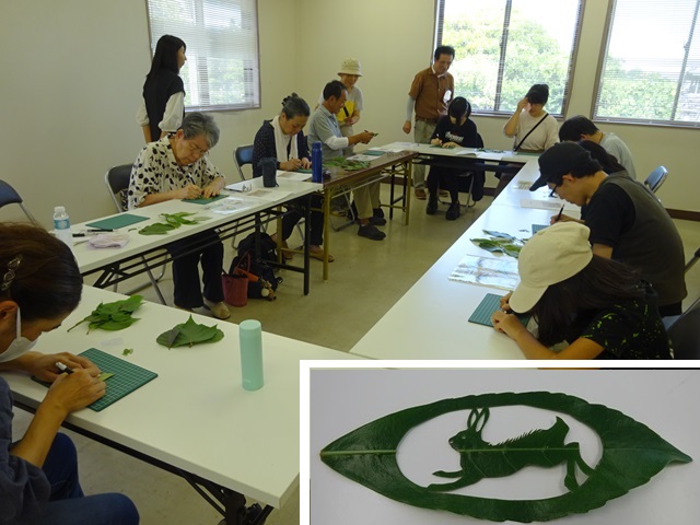 昭和の森の管理事務所の2階で「葉っぱの切り絵でオリジナルしおりを作ろう」が実施されました。参加者は初めてリーフアートをする人、手先の器用な人、子どもから高齢者までみんな楽しみながら思い思いの作品を完成しました。 リーフアートに使われる葉から木の性質もしりました。 |