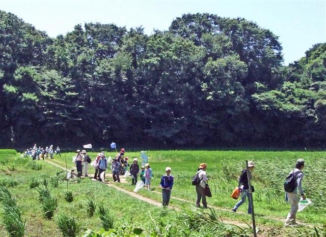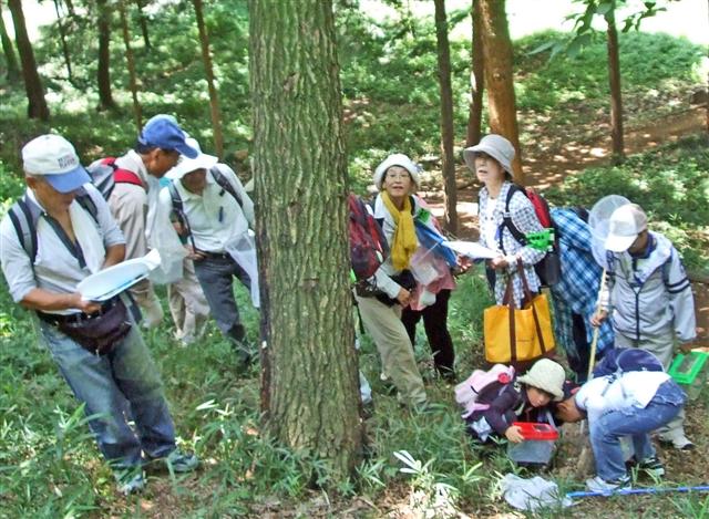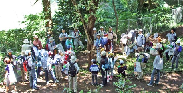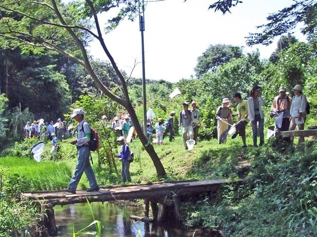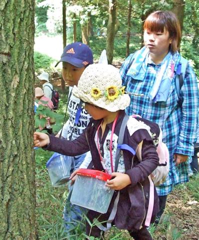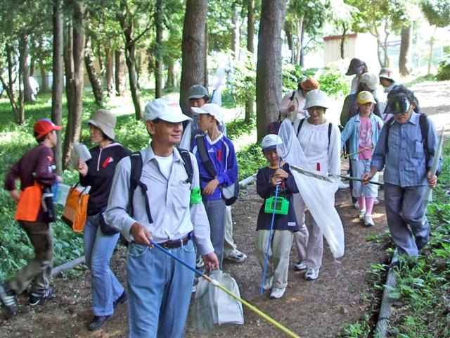 船橋の住宅地に隣接する緑地で、夏休みで虫捕りを楽しむ観察会でした。 |