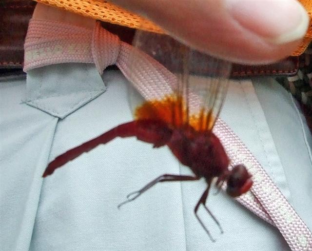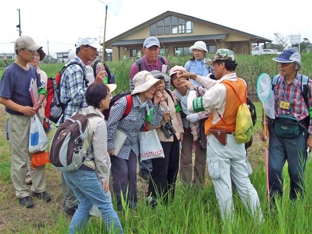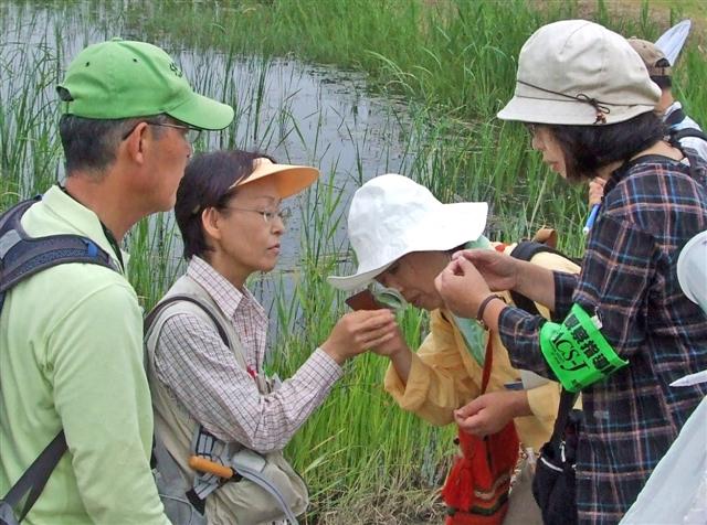 | 夏から秋によく見かける身近なトンボを知るための研修会です。網を片手にトンボ捕りを楽しみました。先ずはチョウトンボがアッという間に飛び去り、次に水草の中にいるアジアイトトンボ・アオモンイトトンボを捕り、シオカラトンボ・ウスバキトンボ・ショウジョウトンボなどを短時間にいろいろなトンボの観察と♂♀の見分け方などの説明を聞きました。日本には214種ものトンボがいるとのこと。 | |
