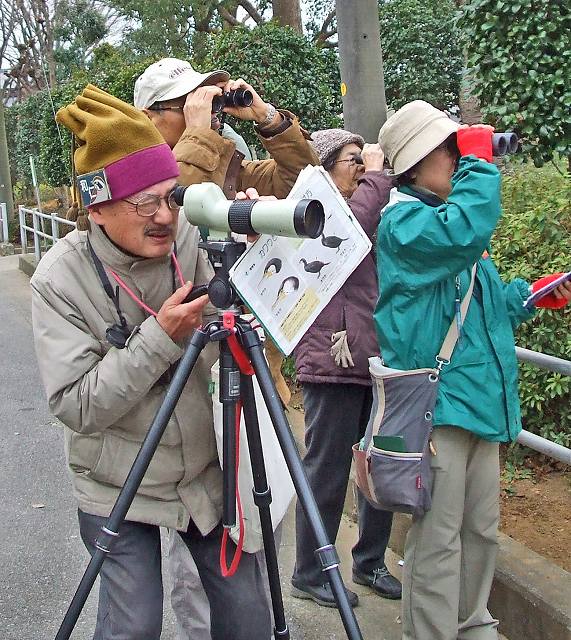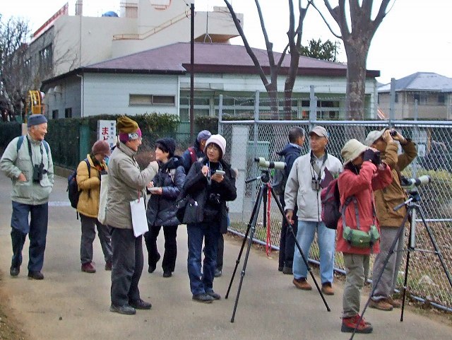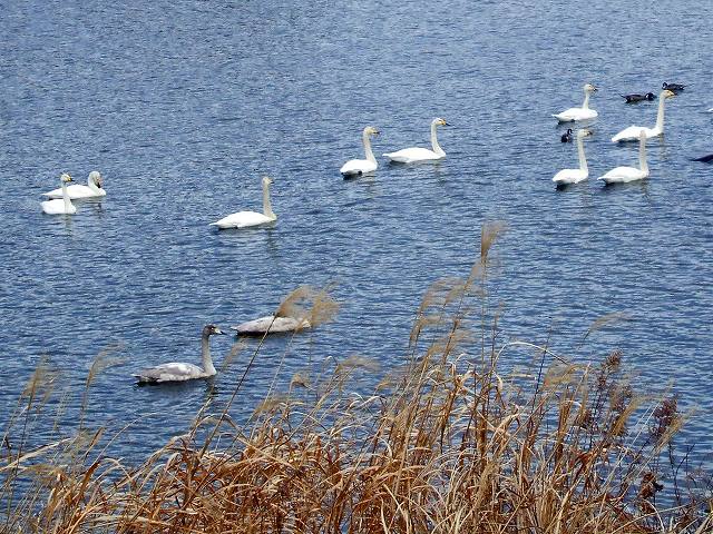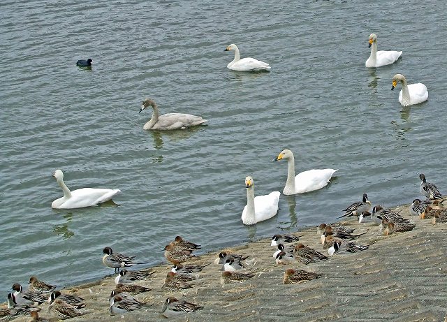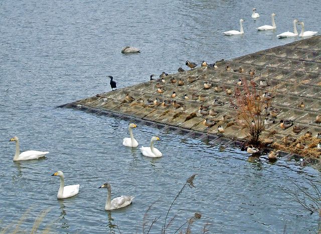 | 清水口調整池に毎年オオハクチョウが飛来しており、優雅な姿が楽しめます。周囲を木々が取り囲んでいて自然な感じで格好の散策場所であり、野鳥観察のポイントです。オオハクチョウが22羽、湖面を優雅に滑っていて、たくさんのオナガガモを中心にカモ類が日当たりの良い護岸で羽を休めていました。その中で羽を広げてクワッ、クワッと盛んに鳴いているのは間違いなく求愛中ですね。サギ類なども併せて25種の鳥合わせでした。南風の吹く一日でしたが、雨に降られず、カモの識別や野鳥観察の要領などについて学びました。 | |