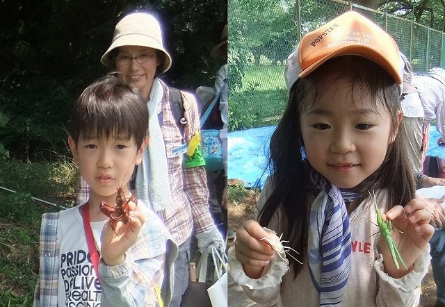 ![]() 03 左:田んぼで捕まえたアメリカザリガニ、右:野原で捕ったショウリョウバッタと白色の抜け殻 |