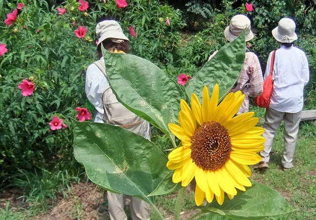![]() 04 太陽が眩しい:夏に映えるヒマワリ、赤い芙蓉、美形の3方 |