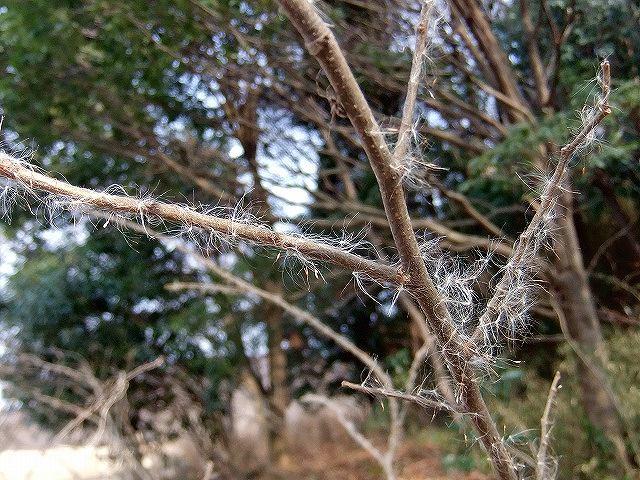 ![]() 09 これは何でしょう? 枯れ枝にガマの綿毛が絡まっている |