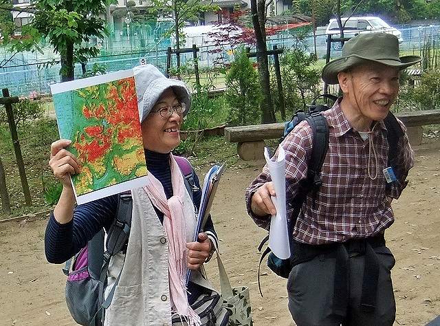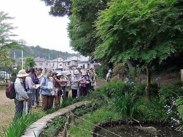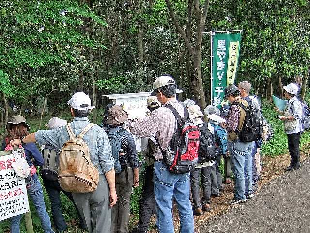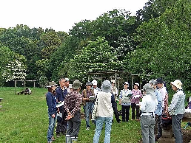 観察会のテーマ:「千駄堀の自然と歴史を訪ねる」で、新緑の中、台地から谷津へと変わる地形を歩きました。松戸市東部から延びる台地に、江戸川沿いから続く低地が入り込んだ谷津の地形がみられ、起伏に富んでいます。出発前の体操で体をほぐし、お互いに相手の様子に気を配りながら歩くこと、坂道の歩き方、階段の上り方。後ろの人と距離が開いていないか、先頭は時々後ろを振り返る などの注意点。キシノウエトタテグモの観察もありました。やや急な斜面です。危ないところでは「危ないですよ!滑るから気をつけて!」と言葉で言うのではなく、手を貸して危険を防ぐという実践をやりました。21世紀の森と広場では、ガイデングリスクアナリシスを作る必要性や、その手順、ファーストエイドの順序、必要な救急用品や持ち物の確認、搬送や休ませる体位なども実践しました。 (文:田中玉枝) | |