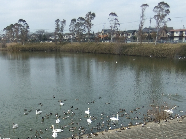 | 今年のオオハクチョウの初飛来は10月27日で、1月15日には16羽になりました。 現在は成鳥11羽・幼鳥2羽でした。オオハクチョウは北極海に近いシベリアのツンドラ地帯から、3~4,000kmもの長い旅路で日本にやってきます。北海道や東北地方に多く飛来し、太平洋側では西白井の清水口が最南限で、当地の記録では、1993年に飛来してから、今年で19回目になります。10~11月に飛来し、3月に北へ旅立ちます。両翼を広げると2.5m、体重8~12㎏、口ばしと両脚をのぞいて全部が白い羽毛で覆われており、カン高い声で「コォーコォー」と鳴きます。池にいるカモ類などは約500羽で、オナガガモが多く見られます。西白井駅から10分程度の調整池で、金網越しに真近に見られ、双眼鏡があるとなお一層楽しめます。当日に見られた鳥は、24種。下見会で観られた鳥は、30種でした。 | |