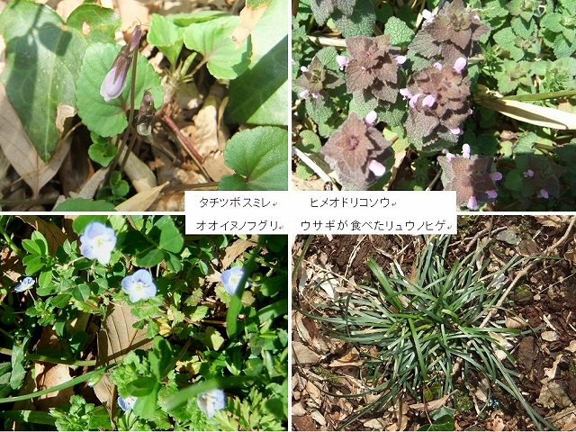 ![]() 06 タチツボスミレ、オオイヌノフグリ、ヒメオドリコソウ、ウサギが食べた ジャノヒゲ |