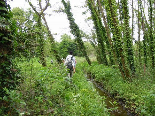 | 鎌ヶ谷市の馬込沢駅から調節池に向かいました。中沢川、二和川、根郷川が合流し、大柏川となる地域で、真間川から東京湾へと流れていきます。大柏川第2調節池予定地辺りはヨシ原が広がり、オオヨシキリが賑やかで、ウグイスも鳴いてくれました。湿地帯では小川沿いに進み、藪コギをしながらハンノキ林を訪れました。(高野さんがよい写真を撮ってくれました) | |