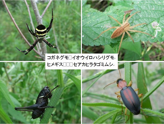 ![]() 07 藪こぎで見られた虫たち:コガネグモ・イオウイロハシリグモ・ヒメギス・セアカヒラタゴミムシ |