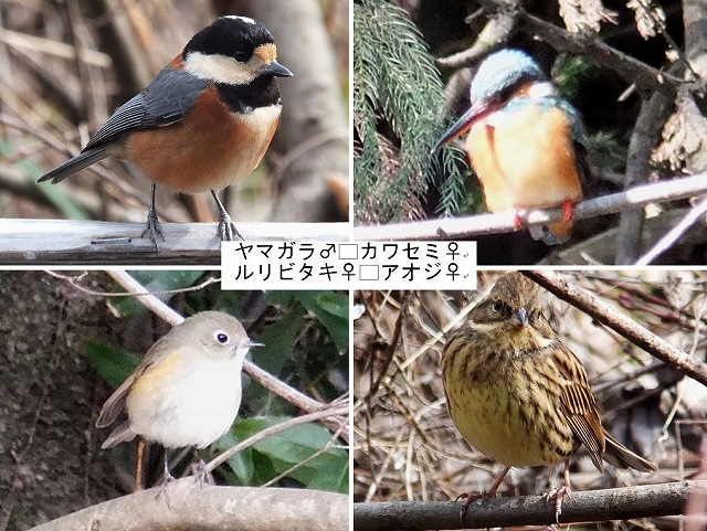 ![]() 08 鳥がたくさん見られました:ヤマガラ♂、カワセミ♀、ルリビタキ♀、アオジ♀ |