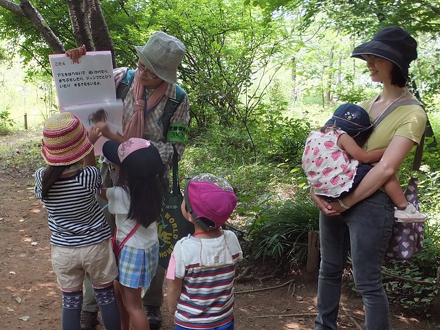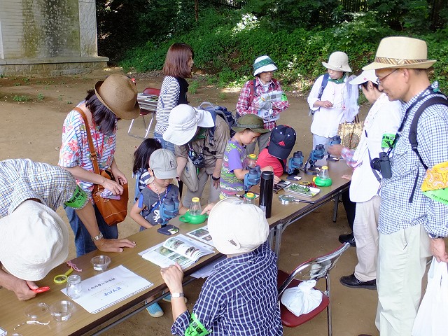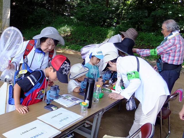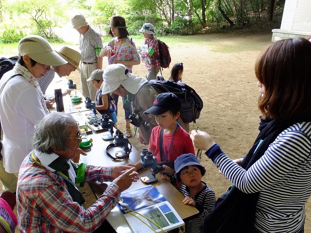 | この公園は、開園20周年であり、松戸市制施行70周年です。「夏休み 見て! さわって! 遊ぼう!」のテーマで、たくさんの催しが盛りだくさんです。パークセンターと共催の観察会イベントとして、子どもたちがたくさん参加。トンボ・バッタ・クモのクイズがあり、ファーブル顕微鏡で肉眼や虫メガネとは違う自然の造形を観察できました。 | |