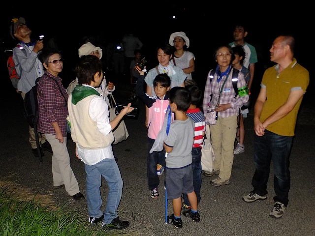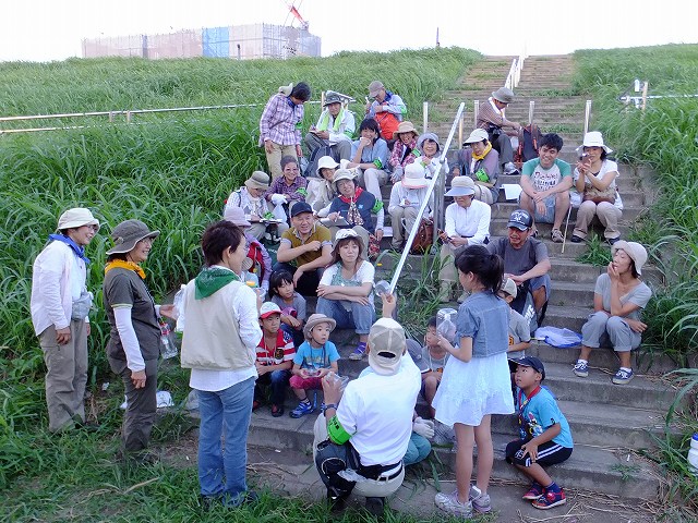 | 夏休みの終わりに「夕涼み観察会」をやろうとの提案。夕方の江戸川の河川敷では、ツバメなどが飛び、日暮れにはアブラコウモリ(別名イエコウモリ)が飛び交う。コオロギ・キリギリス・バッタ類の鳴く虫がたくさんみられ、南西の空には宵の明星の輝く金星が一番星、少し暗くなると夏空の大三角形(ベガ・アルタイル・デネブ)が見られました。バットディテクター(コウモリの発する超音波音声を人間が聞こえるように変換)を用意して、空中で虫をキャッチする音声を確認。鳴く虫の先生:渋谷さんがタブレットで虫の声を再生して、子どもたちにやさしく説明してくれました。 | |