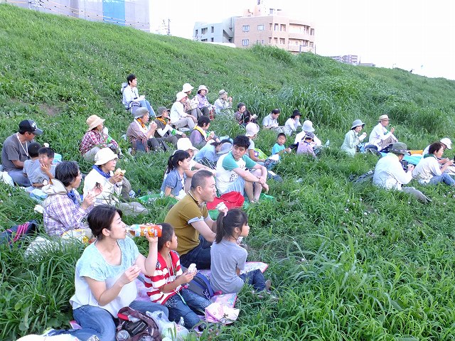 ![]() 05 土手に上がって夕暮れ休憩タイム。おやつを食べて、河川敷の景観を眺め、空を見上げて~ |