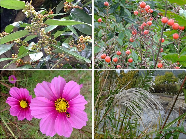 ![]() 10 秋を感じさせるもの:タラヨウの実・ナンテンの実・コスモスにテントウムシ・オギの白い穂 |