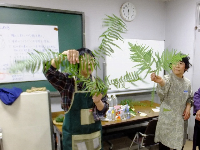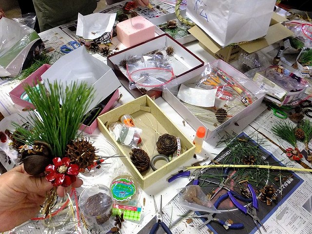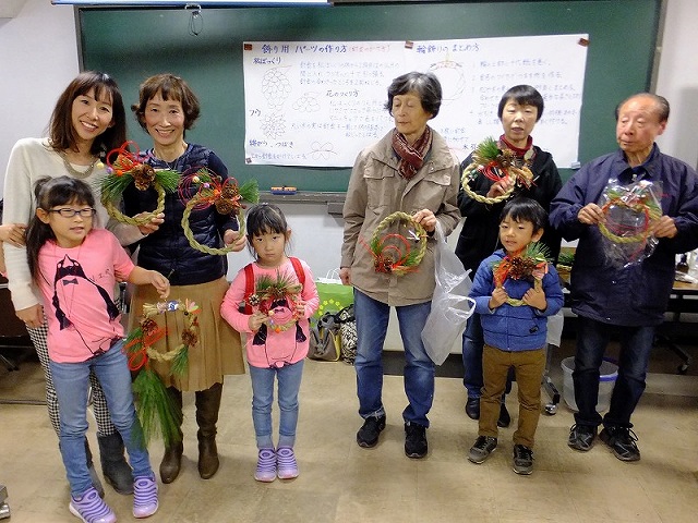 | お正月飾り作りを通して、使われている植物のいわれを知り、人の暮らしと植物のつながりを知ろう! とのサブテーマでした。公園ボランティアが育てた稲ワラ、剪定枝の松葉、マツやヒマラヤスギのマツボックリ、フウ・ハンノキなどの実をたくさん用意しました。お正月にゆかりの植物:ユズリハ、ウラジロ、万両、千両などを紹介。 | |