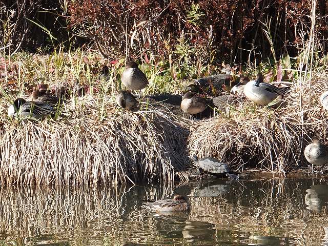 じゅん菜池にはたくさんの鳥:コガモ、マガモ、カルガモ、キンクロハジロ、 |