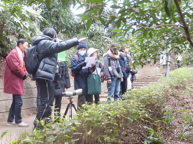 ![]() 01 特に寒い冬は体操で体をほぐしてから観察会に出発です |