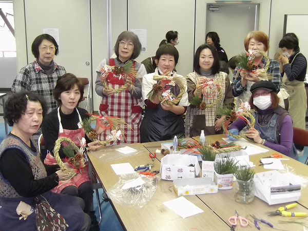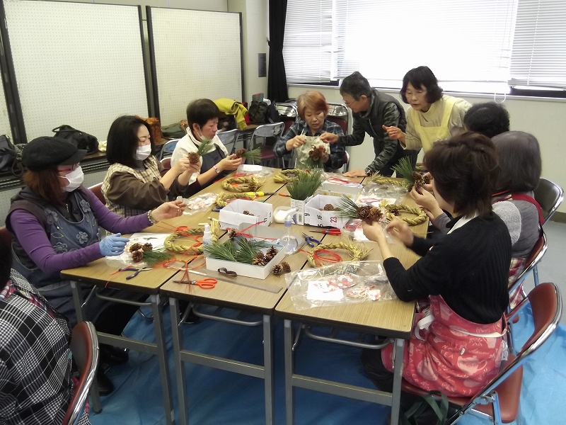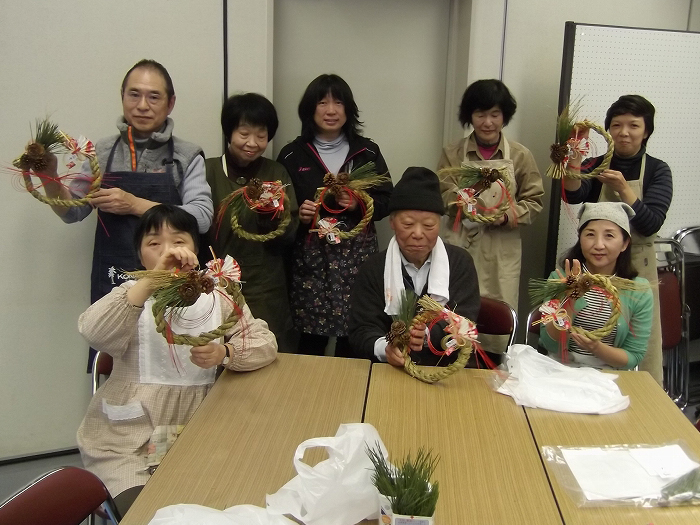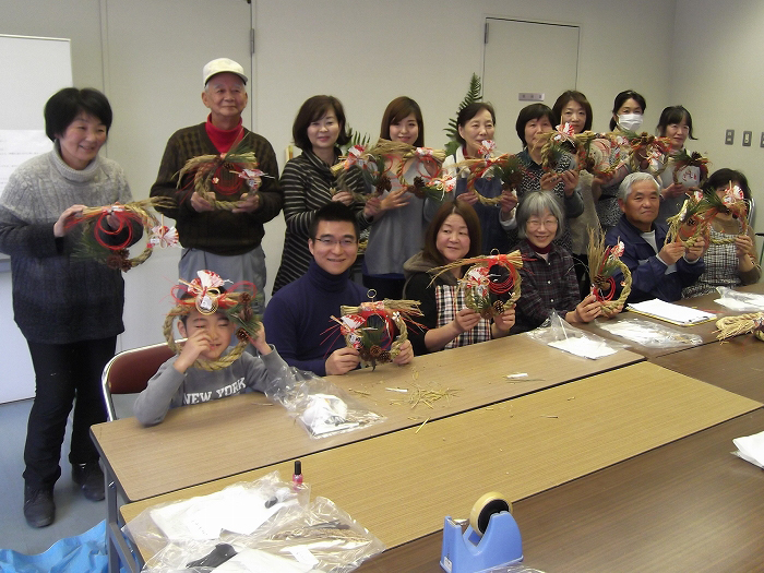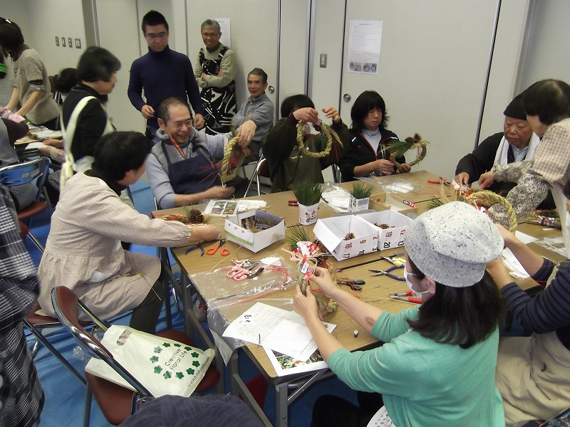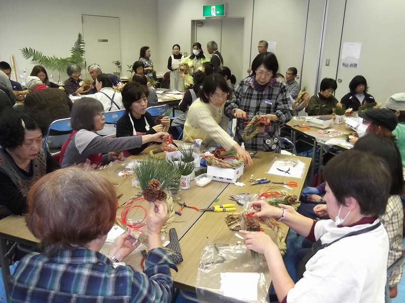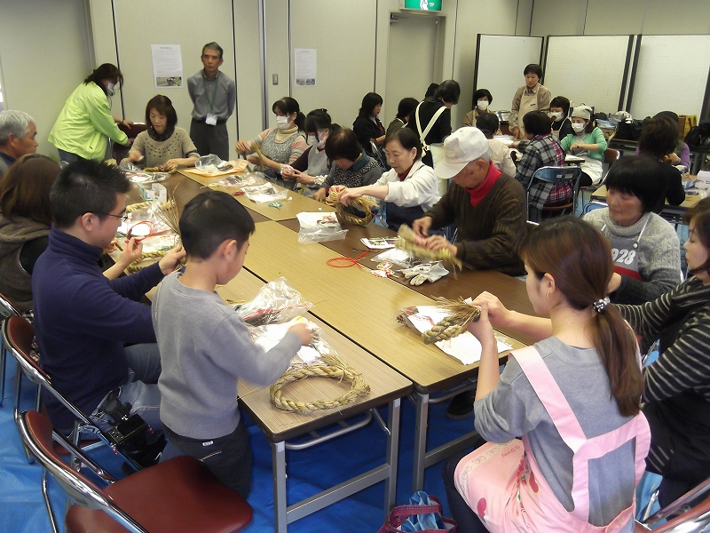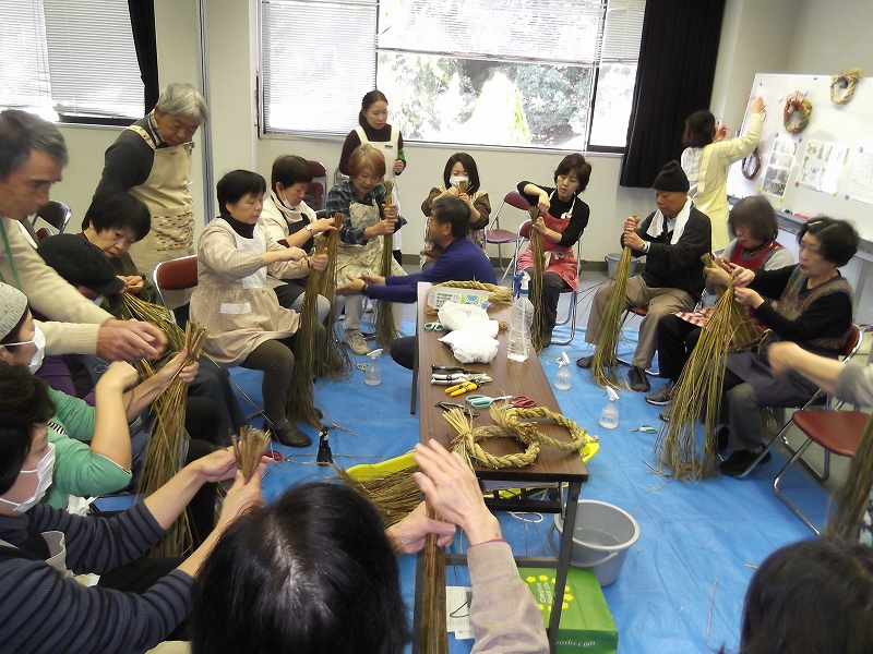 | 人気の高いイベントで広報誌に案内が出るとすぐに定員が一杯になり、昨年参加してよかったので、また今年も参加という親子の方もいて総勢31名。お正月飾り作りを通して使われている植物のいわれを知り、人の暮らしと植物の繋がりを知ろうという趣旨でお話しをして、ユズリハ・ウラジロ・ナンテンに加えて、赤い実のマンリョウからヤブコウジなどの現物サンプルを用意して説明をしました。縄綯いとお飾り作りの二班に分かれて作業を開始。お飾りは水引・松葉・松ぼっくりとヒマラヤスギのローズなどをまとめたもの、扇面と追羽根のピックに稲穂など自然観察会らしい自然の材料をたっぷり使って飾れるように材料を用意。個性的で素敵なお飾りになりました。 | |