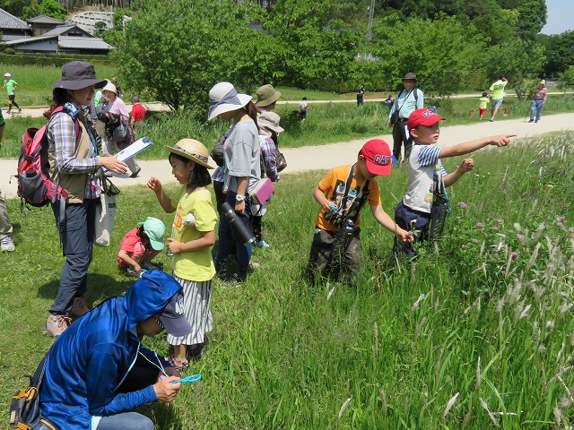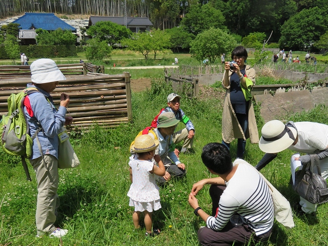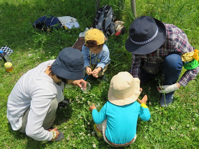 | 知識なんてなくたって、自然の中には遊びのメニューがいっぱい! 発見がいっぱい!五感を使う自然遊びは子どもの心・体・脳の発達にとても良いと言われています。小さなお子さんもパパも・ママも楽しく一緒に過ごしましょう!」という趣旨で新企画に取り組みました。花がきれいに咲き、虫たちが顔を出して大人にも子どもたちにも楽しい季節のみどりの里で7家族が参加でした。 | |