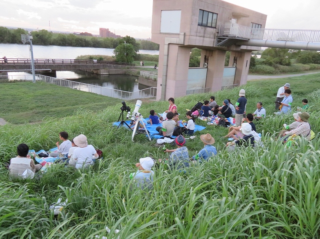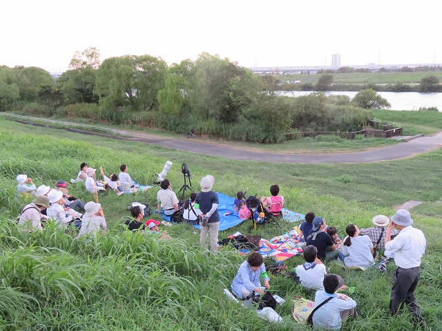 | 猛暑を心配し、次に台風を心配して、やっと開催できたが、日没の頃に流山方面で稲光と花火の賑わいでした。渋谷さんに講師をお願いして河川敷の草原でゲットした虫の同定、軽い夕食休憩で夕日の沈むころにコウモリが出現、一番星も観望、雲に隠れて空の全体は見えなくても望遠鏡で「月・金星・土星」を観て感激! 鳴く虫も少し楽しみました。 | |