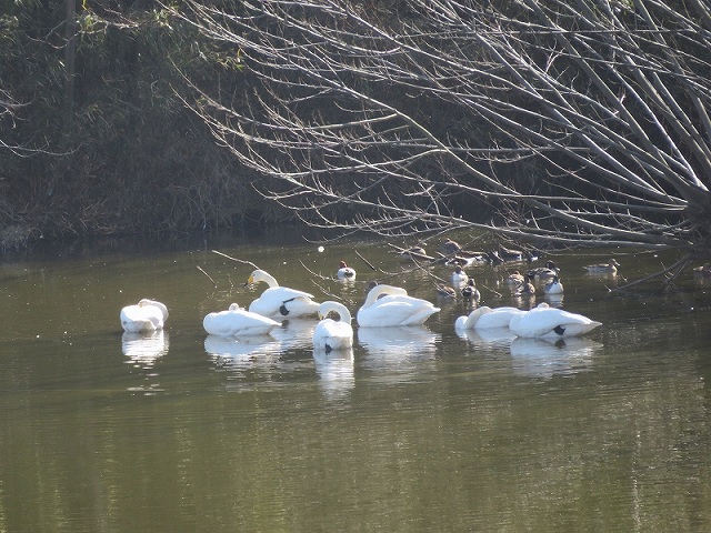 | 北総線西白井駅から徒歩10分の清水口調整池に11月になるとオオハクチョウ・コハクチョウ・マガモやコガモなどのたくさんの冬鳥がシベリア方面から渡って来る。今年のハクチョウは約40羽が飛来して、3月には北に戻っていく(北帰行)。都心から近場にあり、近くで観られ楽しみにしている。 | |