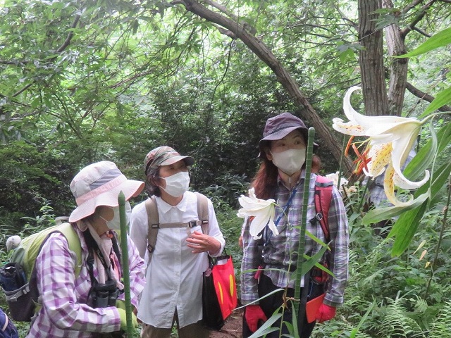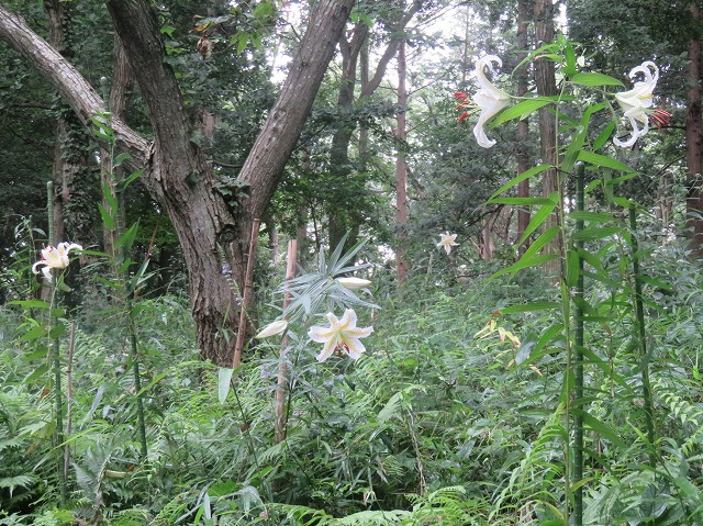 松戸の八柱駅から北に向って住宅地を過ぎ 高低差のある谷津の地形の中を歩き 里やま ボランティア活動をやっている「しんやまの森」に着いて一昨年の台風被害状況やカシノナガキクイムシによるナラ枯れ対策の説明を聞く。続いて 少し先の「芋の作の森」では長年育ててきたヤマユリ200本と出会う観察会。今年は少な目の開花で65輪程度とは言え初めて観る人には素晴らしい! ヒヨドリバナ・アキノタムラソウ・フタリシズカ・コウヤボウキ・ワニグチソウなどが観られてよい観察会でした。 |