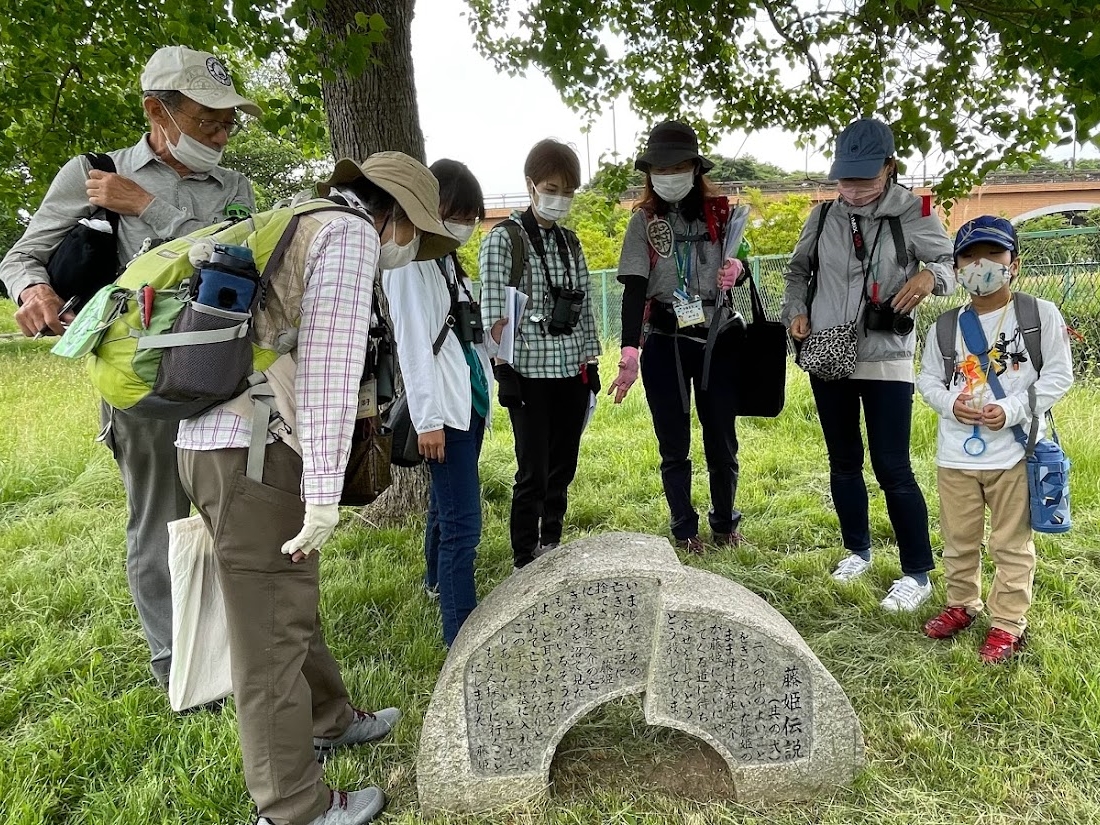 | 梅雨入りの前日で観察会ができました。北柏駅から大堀川のポイントへ~呼塚常夜灯をみて 手賀沼自然ふれあい緑道入口で当地の指定管理者の新松戸造園スタッフから全体の説明をいただき、緑道沿いの樹木の観察、藤姫伝説の石碑シリーズをみて、草刈り残し原っぱでの虫さがしポイントでは虫捕り、北千葉導水管を経由して手賀沼に流れる流れを見学しました。 | |