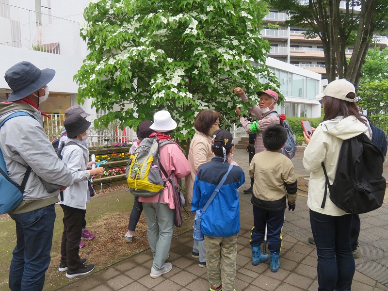 ![]() 02 緑園の道を歩いて ヤマボウシの咲く花を観察、白い花びらに見える総苞片、真ん中の球体に小さく咲くのが花です…虫メガネで観察 |
