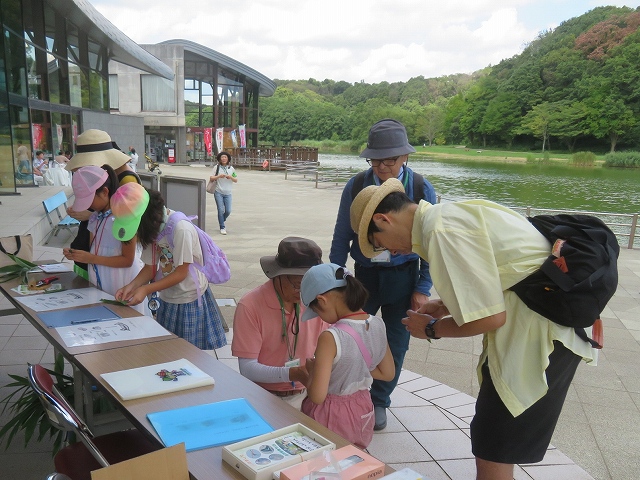 |  暑さ厳しい日でしたが、木陰では時折涼しい風が吹く夏らしい日に開催することができました。自然たんけんラリーは、受付でたんけんカード・鉛筆・虫メガネを受取り、 6 ヵ所のポイントを指導員と一緒に回り、それぞれのポイントで観察・あそび・実験ができ、五感を使った観察ができるように工夫をしています。 | |