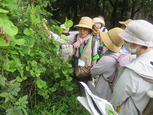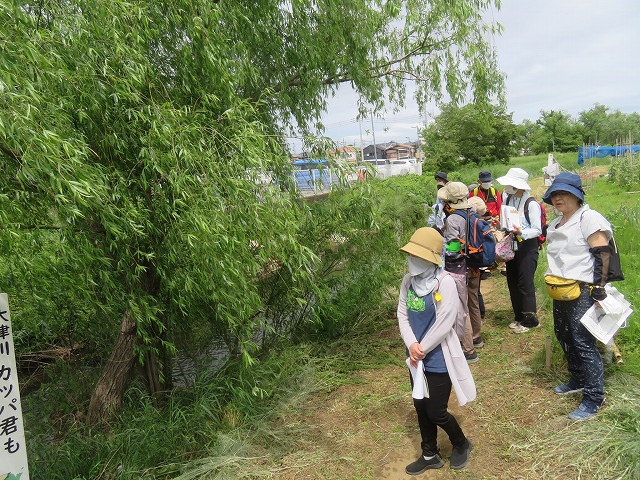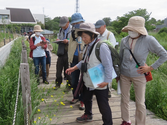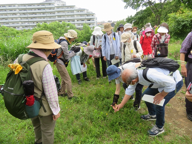 |  鎌ヶ谷市の新しい観察会コースで 東武線六実駅から民家の庭や垣根を観察し、北部公民館から手賀沼に流入する大津川の緑道に入り、川沿いの木道でノイバラの甘い香りが匂う中を歩き。湿った所を好むジャヤナギ、橋の付近にはナガミヒナゲシ、アカバナユウゲショウなど外来種が繁殖。粟野コミュニティセンターで小休止、粟野の森に入ると咲き終りのキンラン、果実となったハナイカダなどが目につき自然が残されていることを感じる。赤い実を付けたウグイスカグラ、マンリョウも多く見られ、カラタチバナ(百両)も生育している。 | |