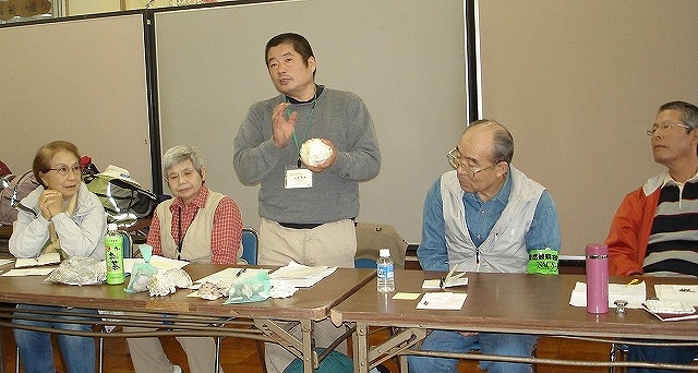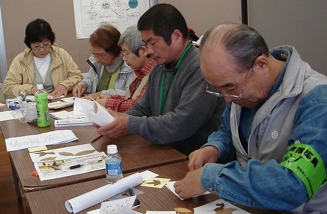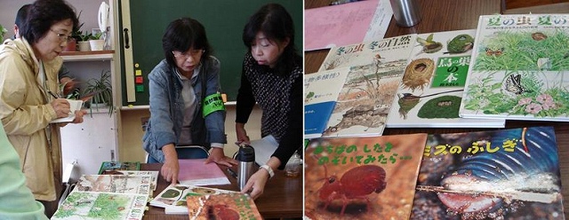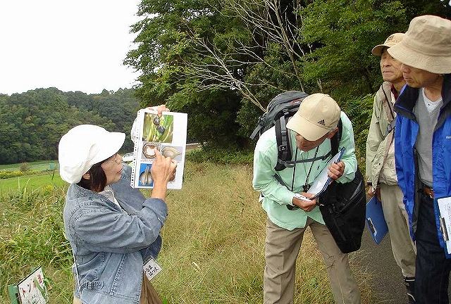 | SSN(小学校支援ネットワーク)は、昨年で10年目、年間72件の自然観察会を支援し、勉強会は49回目になります。午前中は、年間通して観察しているサクラの木などを観察して。道路を10分くらい歩いて谷津田に到着。林縁【裾を小川が流れる】には、ムクノキやエノキの実が食べごろです。ノブドウ、ヤマノイモのつる植物に負けず、真っ赤なニシキギ、ムラサキシキブ、ゴンズイの木々の実りが楽しめました。小川にはサワガニ、ホタルの田んぼではジュズダマを観察しました。ムクノキの葉で10円玉をこすったり、幼虫の足を観察したりしました。午後は学校の会議室で雨の日バ-ジョンを出し合い、発表しあいました。イロハモミジ・シンジュの翼果を飛ばしたり、葉で写し絵や擦り絵を楽しみ、そしてガガイモの綿毛吹き飛ばしには、夢中になりました。また、児童たちと一緒に楽しめたり、不思議を調べたりに役立つ絵本の紹介、波の音が聞こえてくるような貝殻の紹介がありました。 | |