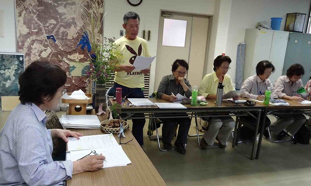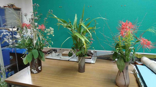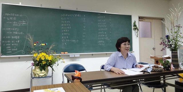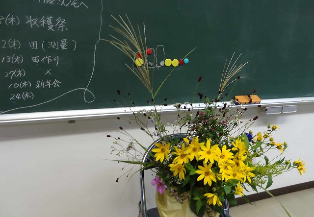 午前の部:観察地の蛍田は湿田。ズボッ・ブシュッと足が潜る、初めは恐る恐る刈っていたが、慣れてきて、ザクッザクッとリズミカルに。おだ掛けの稲の前では、満足の笑み。 午後の部:秋の花を溢れんばかりに飾って、テーマは「秋の七草・お月見・七五三の行事」についての講習会でした。 | |