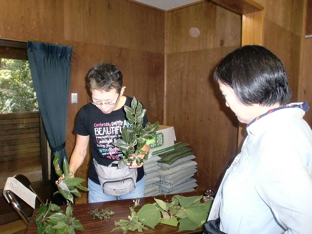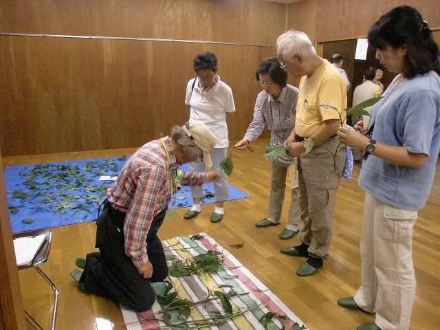 | ①葉の香り ②同じ葉っぱを探そう ③おかしな葉っぱ ④鳥のお話いろいろ の4つのコーナーを4班に分かれたグループが10分ごとに巡って行く、松戸市内の小学校2年生への観察支援の様子を再現したものだった。午後は日赤の指導員からAEDなどの使い方や身近な物を使った救急法を学んだ。 | |