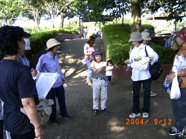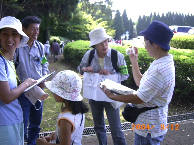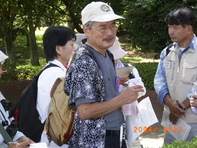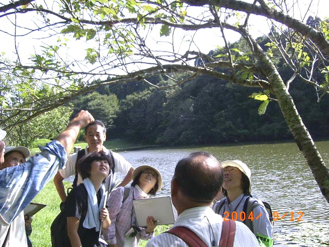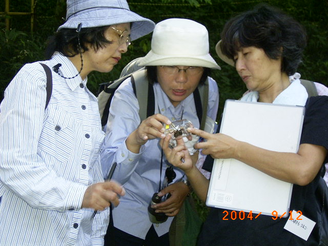 カップレンズでクモを観察しながら指導員の説明を聴く参加者 |