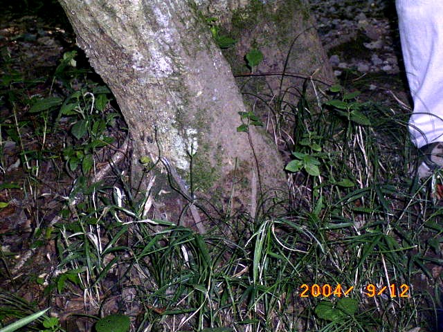 木の根元に地中から地上に管状に伸びるジグモの巣 |