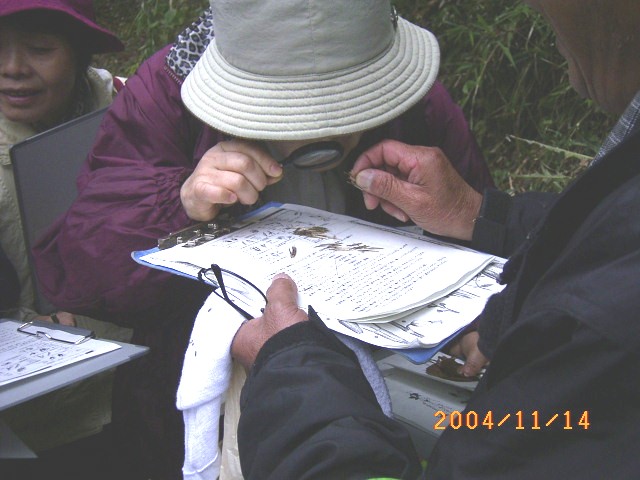 拾い集めた実をグループ全員で散布法別見本と照合する |