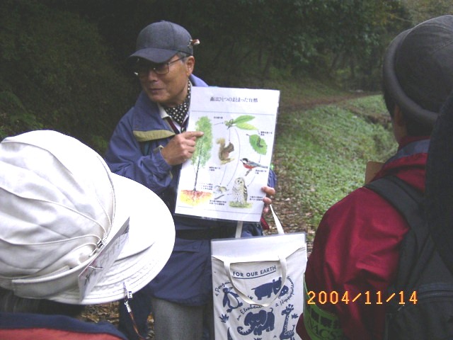 森を例に自然のしくみを説明する指導員 |