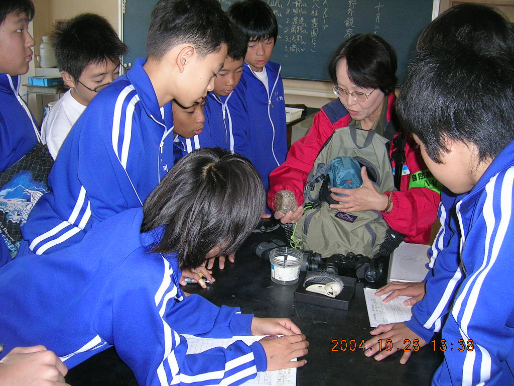 バードウォッチングに出発前、教室で鳥の巣とカラスの頭の骨の標本を皆で