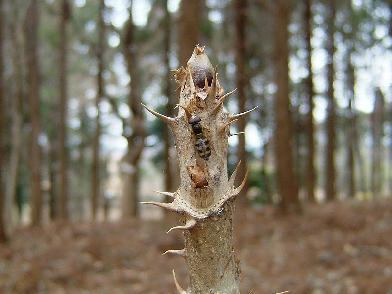 ![]() タラノキの葉痕、維管束痕と春を感じヒラタアブの仲間も |